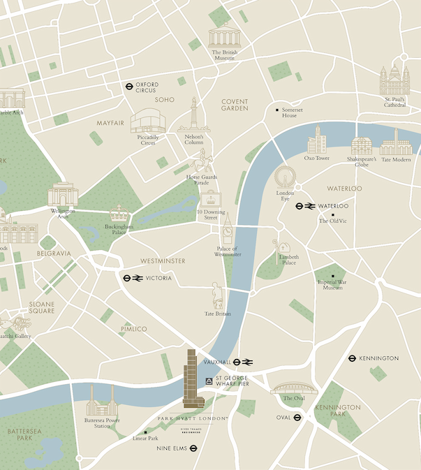 Located in Nine Elms, London's newest cultural and business district, this vibrant riverside location balances urban energy with residential sophistication and waterfront tranquility. Vauxhall and Nine Elms stations are a short walk away, providing direct connections across London.